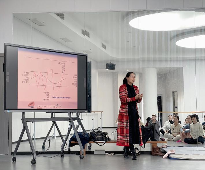 下午,赵妍老师为舞蹈学系师生开设了一场题为“舞动治疗:借助舞蹈和动作表达带来疗愈与活力”的教学沙龙体验课。她向大家介绍了为何舞蹈可以疗愈,以及舞动治疗的基本理念、舞蹈中的意象和意向如何在治疗中发挥作用。赵妍老师作为引导者,带领大家一起体验了一次团体舞动疗愈活动,探索“五律”舞蹈中的五大元素,在共同的舞蹈中寻找宣泄与自我。本次主题沙龙,使同学们深刻体验到了舞动带来的畅快、融入和自在。