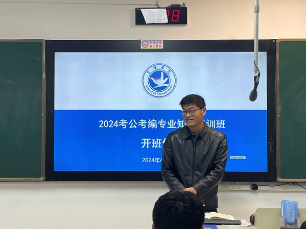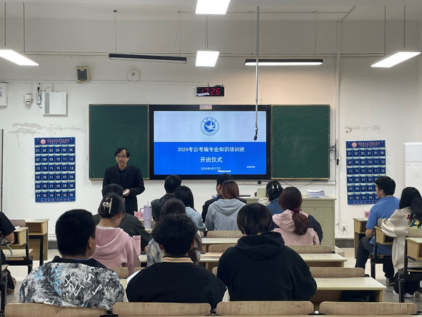 为扎实推进学子高质量就业,切实提高学生综合素质,提升同学们考公考编的能力,2024年4月17日下午,由管理学院举办的2024考公考编专业知识培训班在栖霞校区正式开班,学院党总支书记邱淑永、党总支副书记卢锐航、辅导员陈江铭参加开班仪式,仪式由党总支副书记卢锐航主持。