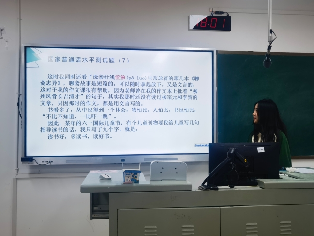 培训就普通话的发音技巧、朗读技巧等方面进行详细讲解,同时,还为参与活动的同学讲解普通话考试的技巧方法和注意事项。同学们非常珍惜此次学习机会,积极配合并努力练习,普通话水平在原有基础上有了较大提升。