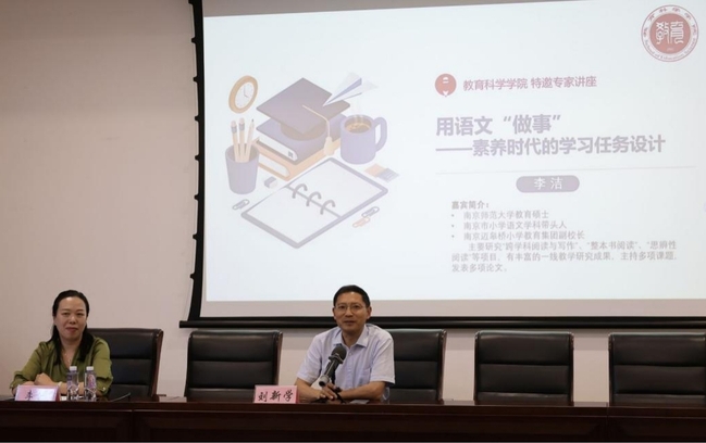 为提升师范生核心素养,培植育人情怀,5月15日下午,教育科学学院特邀南京市小学语文学科带头人、南京迈皋桥小学教育集团副校长李洁,在实验实训大楼301开展题为“用语文‘做事’——素养时代的学习任务设计”的讲座。此次讲座由刘新学院长主持,小学教育专业学生参加此次讲座。