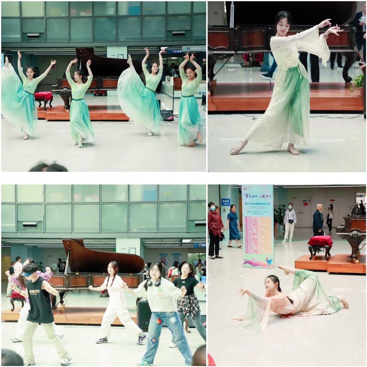 演出在《昨夜小楼又东风》温柔的独唱声中拉开序幕,悠扬的旋律、动人的歌词带领着现场的观众穿越回那个充满诗意的年代去领略古典诗词的魅力。乐队倾情演奏的《等我回家》,悠扬的旋律感染力十足,扣人心弦。独唱《敕勒歌》以其宽广的音域和深情的演绎,把古典民歌的韵味展现得淋漓尽致。小合唱《为了谁》《和你一样》在美妙的歌声中用最直白的方式表达着最真挚的情感。动感十足、激情满满的舞蹈串烧《rhythm》向驻足观赏的患者和家属及医护工作者们展示着青春的美好和生命的绚烂;《青花瓷》《花神》《春颂》《再别康桥》则向大家展现了东方古典美与现代舞蹈的完美结合,灵动的舞姿散发着蓬勃的朝气活力。戏曲表演《锁麟囊》唱念做打俱佳,一招一式尽显功底深厚,唱腔婉转悠扬,余音绕梁,令人沉浸其中。