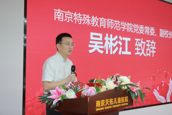 副校长吴彬江在致辞中表示,我校自2015年开始开展孤独症康复专门人才培养和研究,陆续开设相关专业,培养了一批活跃在一线的孤独症康复专业人才。南京市天佑儿童医院在孤独症儿童临床研究、儿童康复人才培养方面也进行了积极的探索,此次合作有助于优势互补、资源共享,希望双方能够进一步完善孤独症康复的理论依据,将研究成果转化为临床实践,促进儿童康复工作的专业化发展。