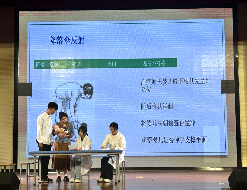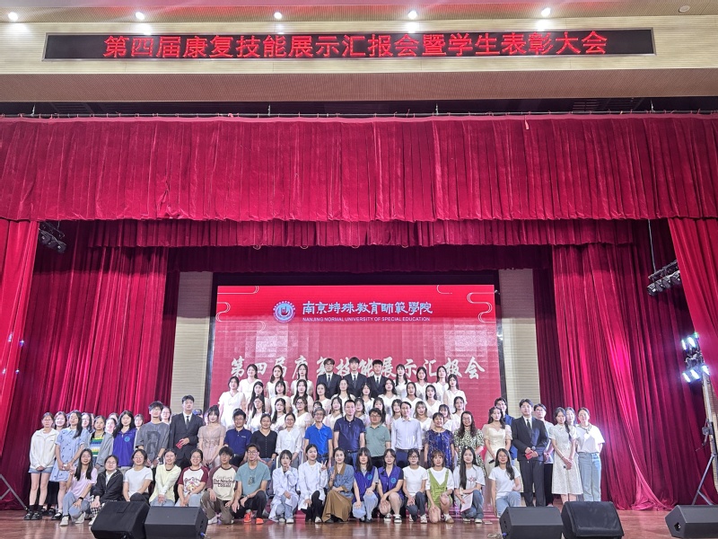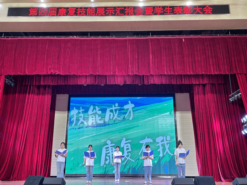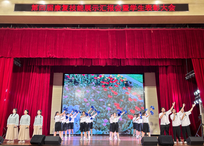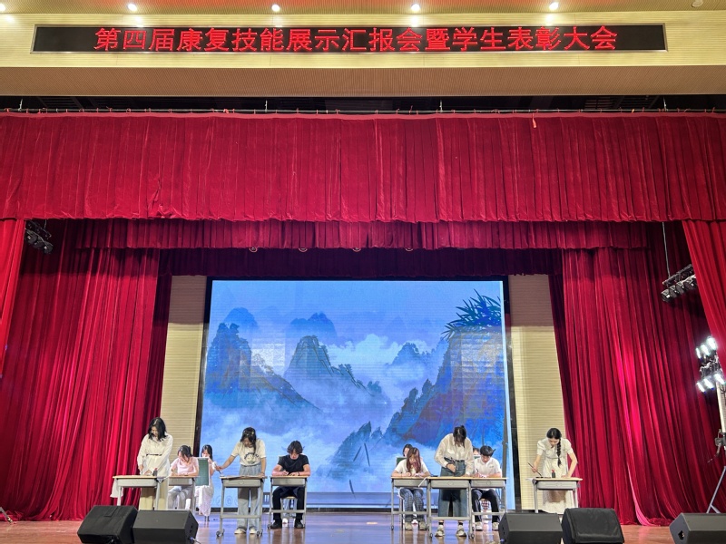 汇报展示在开场舞《Diamond》的欢快活泼旋律中拉开帷幕,演员们热情奔放,跳出了新时代大学生的青春模样;在《书写技能展示》环节,教育康复学专业的师范生用毛笔或钢笔、粉笔,一笔一画,一点一捺间,一个个美观的汉字从同学们的笔尖流淌而出;多人朗诵《技能成才,康复有我》文辞精炼,颇具感染力,彰显了康复科学学院学子对专业的热爱与信念;情景剧《我的成长旅途》以该院学生真人真事作为创作素材,向在场的观众们讲述了一位学生与康复事业结缘,通过努力最终成长为一名优秀康复教师的动人故事;歌舞表演《上春山》,用活泼的演唱、轻快的舞蹈,将观众带到怡人的大好春光之中;康复2104班迪力胡马·吾麦尔江同学在演讲《在迷茫中寻得方向,在实践中增长才干》中分享了探索“大龄心智障碍者康复师”的过程,展现了康复学子勇于探索、大胆实践的良好精神风貌;2021级余思睿、陈迁秀等同学带来技能展示《一例全面发育迟缓幼儿的评估与家庭指导》,以真实的工作环境为背景,配合幻灯片讲解,凸显了娴熟的专业技能,赢得在场观众的一致好评。大会最后在大合唱《有我》中完美落下帷幕。