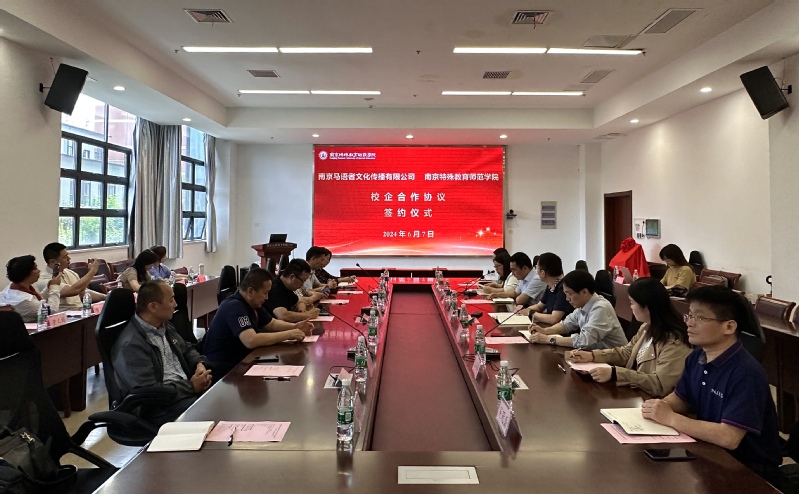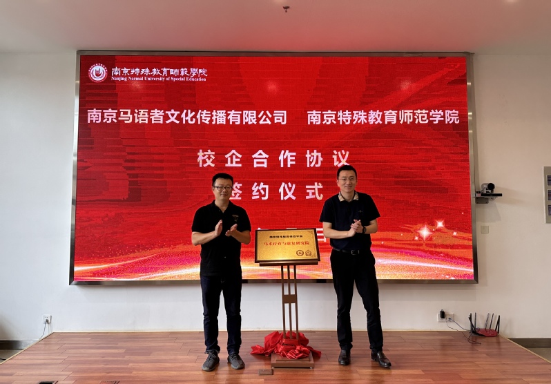 为推进落实校企合作,促进产教融合协同育人,6月7日,南京特殊教育师范学院与南京马语者文化传播有限公司签订校企合作协议,并为“南京特殊教育师范学院马术疗愈与康复研究院”揭牌。南京马语者文化传播有限公司总经理彭彭、南京脑科医院神经精神病学研究所主任高润、陈建国、爱尔兰国际马术产业管理学院大中华区招生官马龙等参加仪式。党委常委、副校长吴彬江,相关职能部门负责人及康复科学学院班子代表参加签约仪式。会议由康复科学学院副院长王姣艳主持。