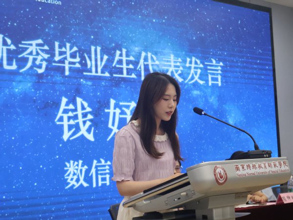 优秀毕业生代表钱妤菡在发言中对母校和老师的精心栽培、悉心教导表达最诚挚的感谢,并向大家分享了自己在四年大学生活中的众多收获;表示在人生新征程上将始终秉承南特人“博爱塑魂”的校训精神,争做起而行之的行动者,在未来工作岗位上谱写出属于自己的青春乐章。