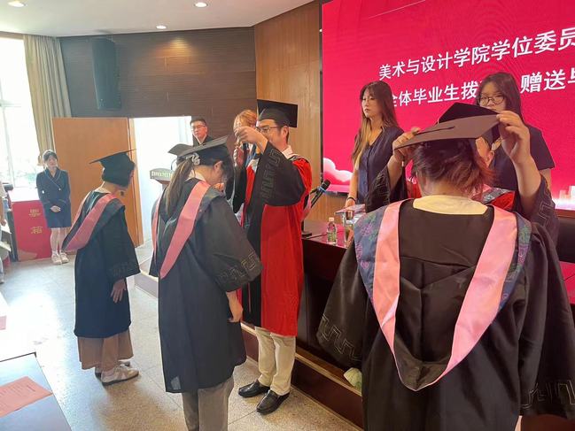 典礼中,美术与设计学院学位委员会成员为全体毕业生进行拨穗,并一一赠送毕业礼物。这不仅是对毕业生们学业成绩的认可,更是对他们未来人生的美好祝愿。拨穗期间,毕业生们饱含深情,与四年中教过自己的老师合影留念,表达了他们对母校、对老师依依不舍的心情。