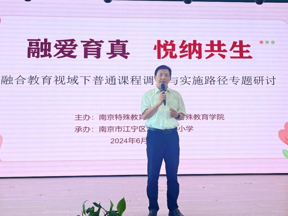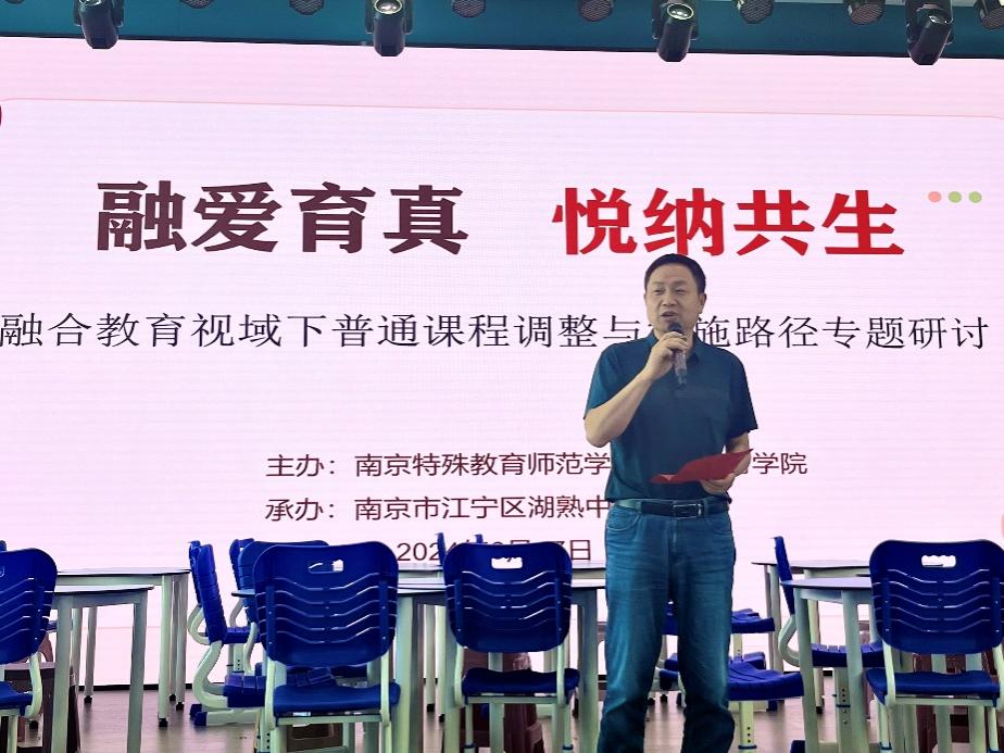 研讨会上,学校党总支书记、校长茅洪锋发表致辞。他以湖熟地方特色为切入点,系统介绍了学校的发展历程、办学理念、校风校训及融合教育等方面的发展成就。他强调,学校始终秉持“关心群体,关注个体”的教育理念,致力于为特殊儿童提供全面的关怀与支持。