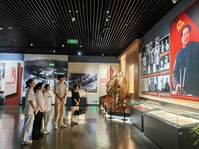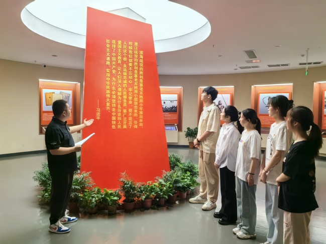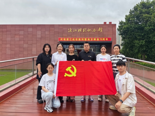 为庆祝中国共产党成立103周年,弘扬伟大建党精神,激励学生党员践行初心使命,6月28日,语言学院学生第一、第二党支部开展“赓续红色血脉 淬炼党性品格”主题党日活动,学生第一党支部书记杨菊鑫、学生第二党支部书记翟玉杨、辅导员郑丹丹和赵楠楠老师带领学生党员、党员成长服务中心成员参观渡江胜利纪念馆。