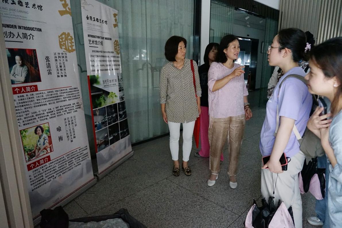 6月25日下午,实践团前往金陵玉雕张清雷艺术馆参观学习。江苏省工艺美术大师喻梅老师热情接待,并一一讲解了精致又别具特色的玉雕。玉雕是根据不同玉料的天然颜色和自然形状,经过精心设计、反复琢磨,由玉石雕制成的精美工艺品。团队还一同参观了制作玉雕的工作台和生产车间,近距离观摩玉材的切割打磨。