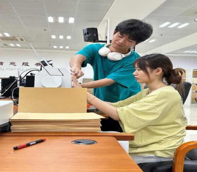 在盲文阅览室,成员们对相关资料进行编辑、转译、打印、校对和装订。大家在老师的指导下裁剪盲文纸、学习盲文打印机器的使用方法,在不断的学习中,成员们能够沉着冷静地应对机器的各种突发状况,实践活动进展的越来越顺利。紧接着,大家将打印的盲文课本进行审核与页码整理,初步认识并学习了一些基础的盲文。最后,大家将盲文教材进行打孔并用胶圈装订成册。