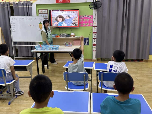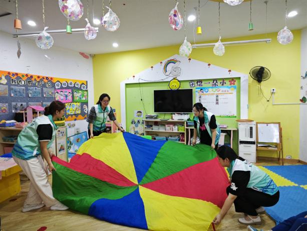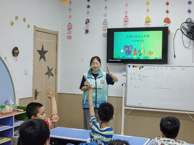 7月1日,志愿者们在学前融合班开展音乐节奏感知主题课程——《我们都是好朋友》。课程以音乐为媒介、以心理健康为主题,引导学生在音乐中感受小狗、小猫、小鸭等动物叫声的节奏,使学生进一步展开想象,用乐器进行模仿,引导他们表达自己的内心世界,有效缓解学生的焦虑与紧张。同时,主讲同学积极与幼儿们进行互动,引导幼儿在讨论小动物们聚会的话题中增进感情。活动尾声,孩子们通过合作音乐游戏《彩虹伞》,以歌声传递心声,增进友谊,体验友情的温暖与音乐的魅力。