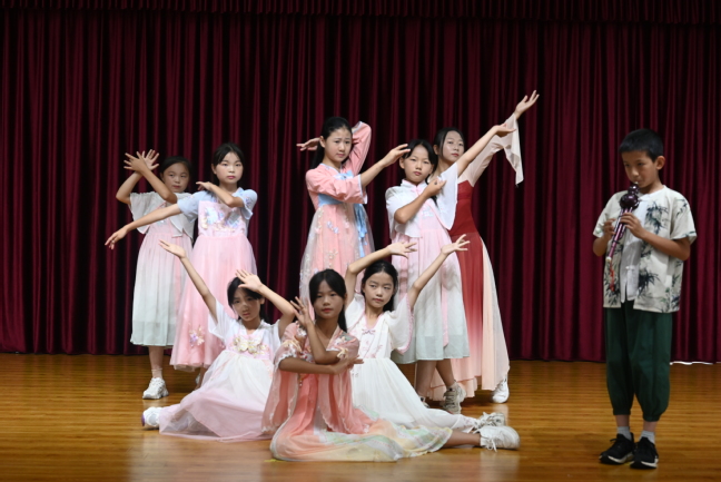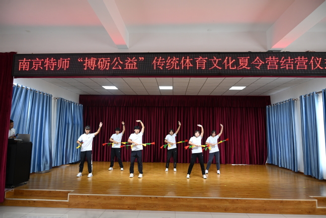 在结营仪式的课程成果汇报演出上,夏令营学员们表演自信而快乐,一个个精彩的演出迎来了阵阵掌声。《武术操》成果展示中,报告厅内响起了《男儿当自强》励志旋律,60名学生排着整齐的方队,在志愿者口哨的指挥下,打出了团结,武出了精神;传统体育《五步拳》由中年级学员完成,学员们动作舒展大方、快速有力、节奏分明、起伏多变、转折灵活;《三路长拳》由高年级学员代表完成,他们姿势舒展、动作灵活、节奏鲜明;歌曲《离别开出花》表达了孩子们对本次夏令营活动的依依不舍;剧目《少年中国说》,唱出了当代少年的朝气蓬勃;才艺表演《荷塘月色》集舞蹈、葫芦丝与太极表演于一体,节奏轻快明朗,旋律清净动人。12天里,志愿者们拜师求学,用快乐的舞姿展示了当地非遗舞蹈——花棍舞,夏令营学员代表们展示了本次夏令营具有代表性的兴趣拓展项目——健身舞龙。