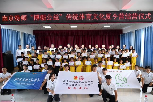 7月17日,由南京特殊教育师范学院“搏砺公益”主办的传统体育文化夏令营在陕西省商洛市商南县清油河希望小学正式结营。县委副书记、南京市溧水区对口帮扶商南县联络组组长钱锋,我校党委常委、纪委书记于林惠,南京阳光心汇心公益基金会秘书长韦宇群,清油河希望小学校长韩立群,商洛市商南县、南京励志阳光心汇心公益基金会其他有关领导,南京特殊教育师范学院、清油河希望小学其他相关领导、老师以及夏令营全体志愿者、学员及家长参加结营仪式。