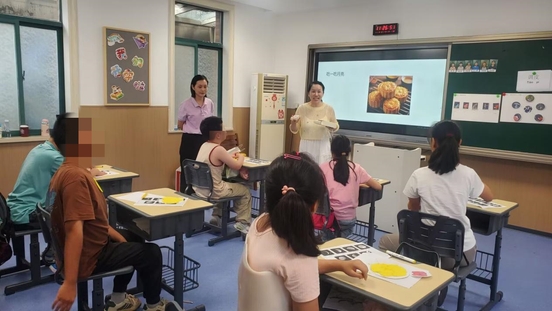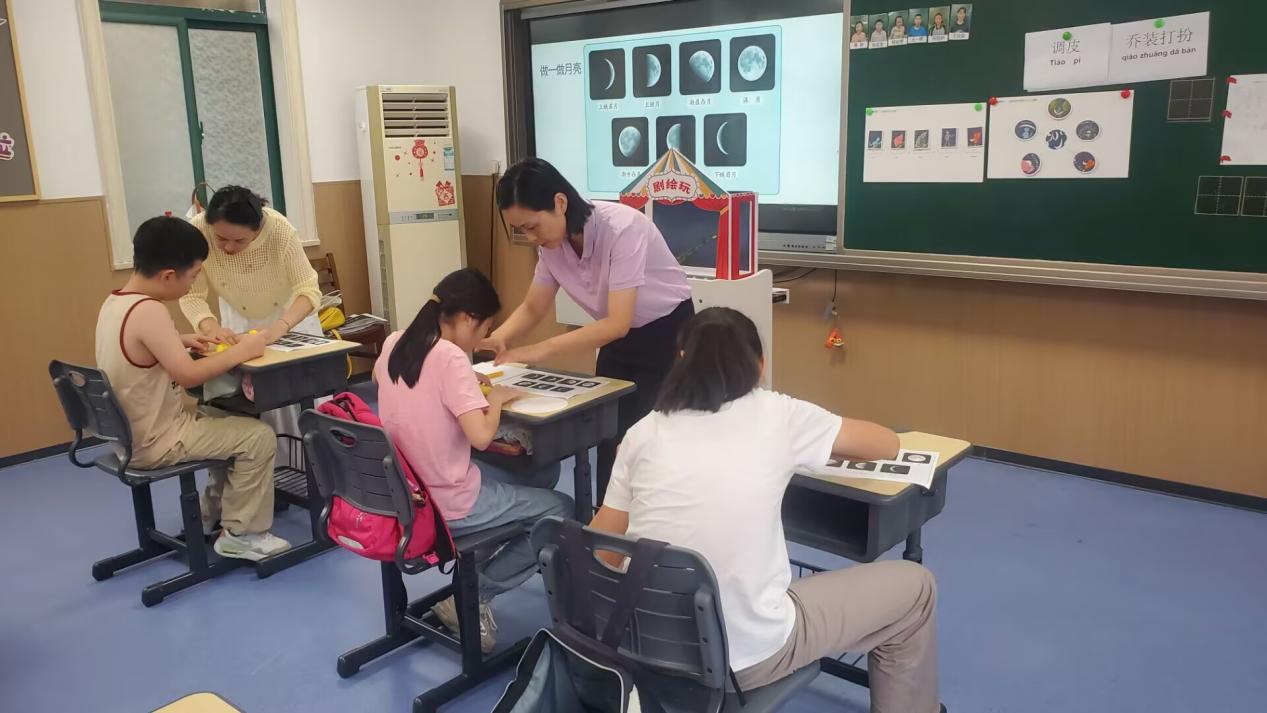 课堂上,志愿者们摒弃传统讲授模式,针对孩子的残障特点设计多感官互动环节,让每个孩子都能“触摸”到月亮。“读月亮”时,志愿者用温柔的语调讲述绘本故事,同时手持月球模型、展示月亮形状卡片,为视力障碍孩子细致描述画面细节,为自闭症孩子提供稳定的语言输入;“做月亮”环节,志愿者为脑瘫孩子递上辅助握笔工具与超轻黏土,手把手协助他们绘制、捏制新月与满月,用触觉与视觉联动加深记忆;“演月亮”中,志愿者耐心引导孩子用简单词语或肢体动作模仿月亮形状,及时给予鼓励,帮助他们突破语言表达与肢体协调的障碍;最后“吃月亮”环节,各种馅料的月饼登场,孩子们在味觉体验中巩固对月亮变化的认知,课堂氛围温馨又活跃。整节课堂气氛融洽,孩子们认真听课,积极互动。玄武特殊教育学校语文组的老师也参与观摩了课程。
