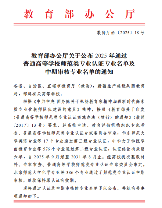 近日,教育部办公厅公布了《关于2025年通过普通高等学校师范类专业认证专业名单及中期审核专业名单的通知》,我校特殊教育专业和学前教育专业通过师范类专业第二级认证,认证有效期为六年(2025年9月至2031年8月)。