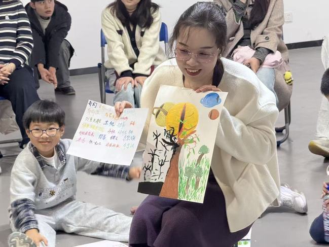 分享交流环节氛围热烈,孩子们主动分享作品背后的心声:“我画了棵大大的树,枝桠要伸得远远的,想把温暖送给爸爸妈妈和小伙伴。”稚嫩话语里满是纯粹与善意。志愿者们逐一反馈观画感想,从专业角度给予肯定,更以温暖语言回应孩子们的内心表达,让孩子们在表达与倾听中深化自我探索。