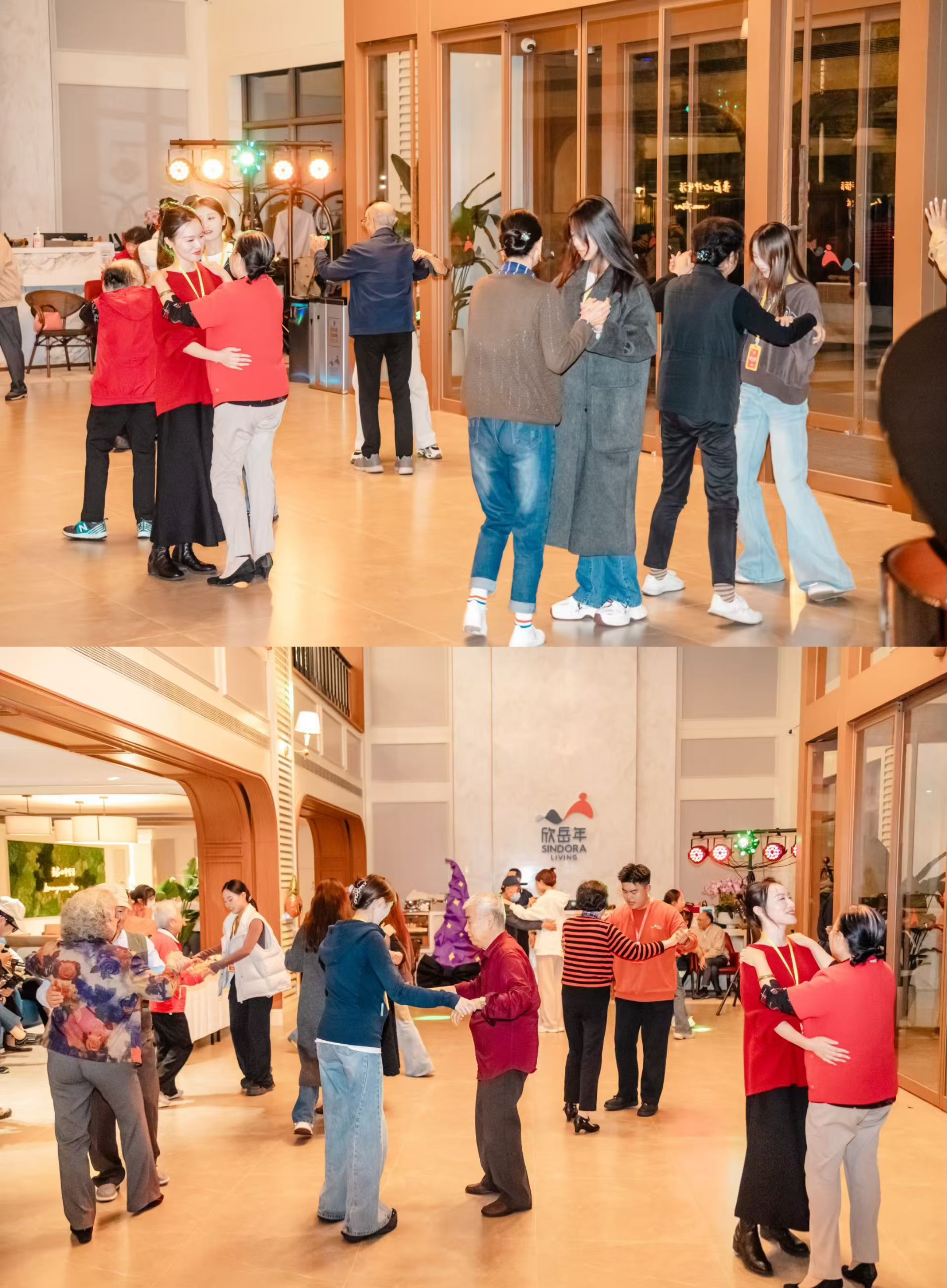 舞会尾声,《你要跳舞吗》的动感旋律将现场氛围推向高潮。学生们主动拉起手组成 “小火车”,长者们纷纷加入 “欢乐列车”,手搭肩跟着节奏绕着大厅缓缓前行。步伐虽缓,却步步踏在欢乐的节拍上,也踏在音乐与舞蹈学院“博爱育人”的思政初心上。