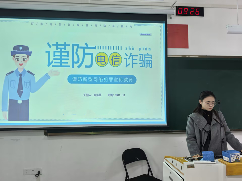 陈沁柔同学通过精心制作的PPT,系统讲解了当前高发的电信网络诈骗类型与特征。讲解紧密结合大学生生活实际,重点分析了网络刷单、冒充客服、虚假贷款、AI换脸、“机票改签”等诈骗手法的作案流程和欺骗性。通过真实案例的数据对比和法律条文解读,同学们深刻认识到诈骗犯罪的危害性,增强了学习反诈知识的紧迫感。