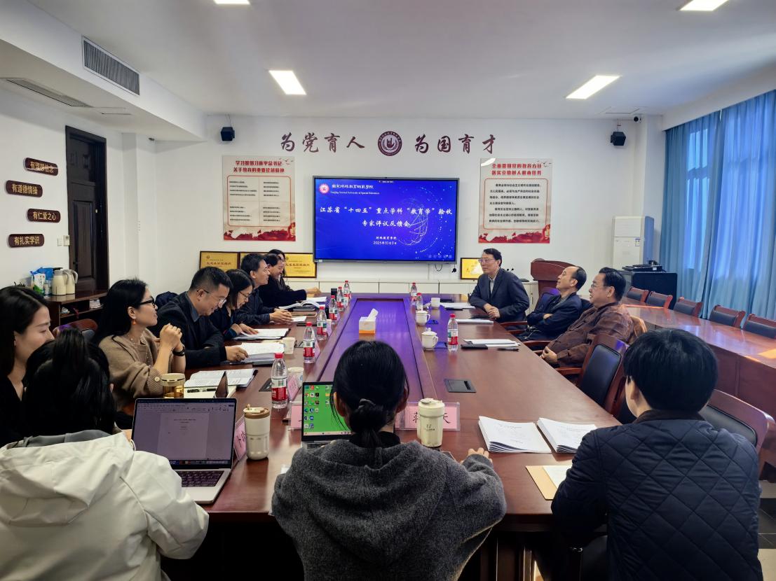 为深入推进教育学学科建设,全面总结“十四五”期间教育学学科建设成果,2025年11月5日上午,“教育学”江苏省“十四五”重点学科建设研讨会暨专家评议反馈会在博雅楼2401会议室顺利召开,由特殊教育学院举办。中国教育学会特殊教育分会副理事长丁勇、南京师范大学教育科学学院教授胡建华、南京特殊教育师范学院特聘教授徐云应邀出席。特殊教育学院院长李拉、教育科学学院院长刘新学、康复科学学院院长王姣艳、校学科建设办公室副主任张伟锋、特殊教育学院副院长何燕春及王辉教授和学院部分博士教师共同参会。