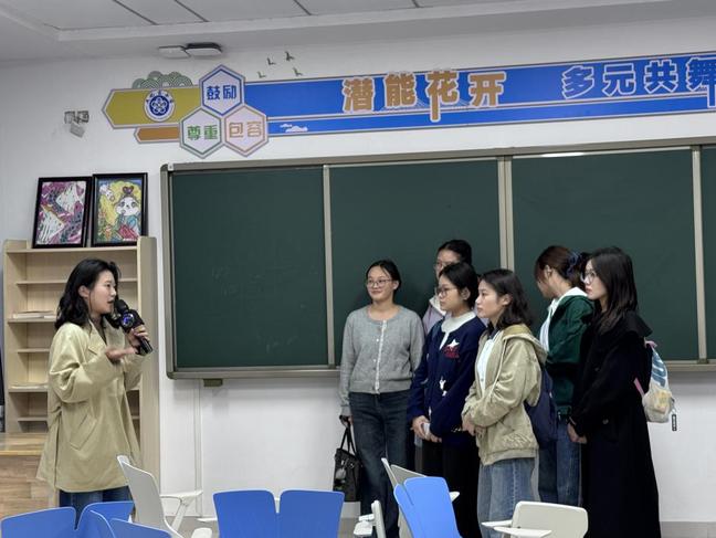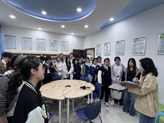 随后,师生队伍移步至学校的融合教育资源中心,由教育科学学院优秀毕业生——严欣老师负责讲解。严老师不仅概述了中心的发展历程与整体运作情况,更引导大家逐一参观了感统训练室、个别化辅导室、资源教室等多种功能空间。她现场展示并讲解了多种特制教具,让同学们对融合教育的“精准支持”有了更为具象化的理解。