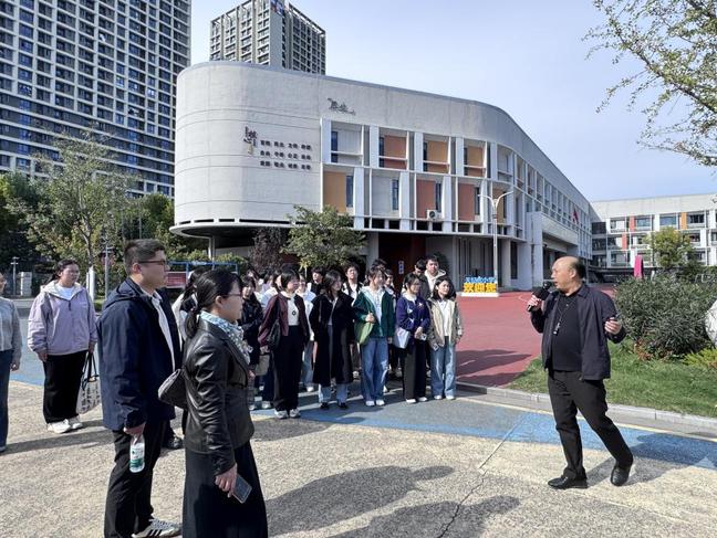 天妃宫小学教导处主任、融合教育资源中心负责人夏金元首先带领师生们漫步校园,实地感受这所百年名校深厚的文化积淀。他详细介绍了学校的起源与办学历史,以及校名随时代变迁经历的十三次变更。夏主任还指出,学校“厚生为本、日新为道”的办学理念,正深深植根于这片悠久的历史沃土,并在校园环境的每一个细节中得到生动体现。