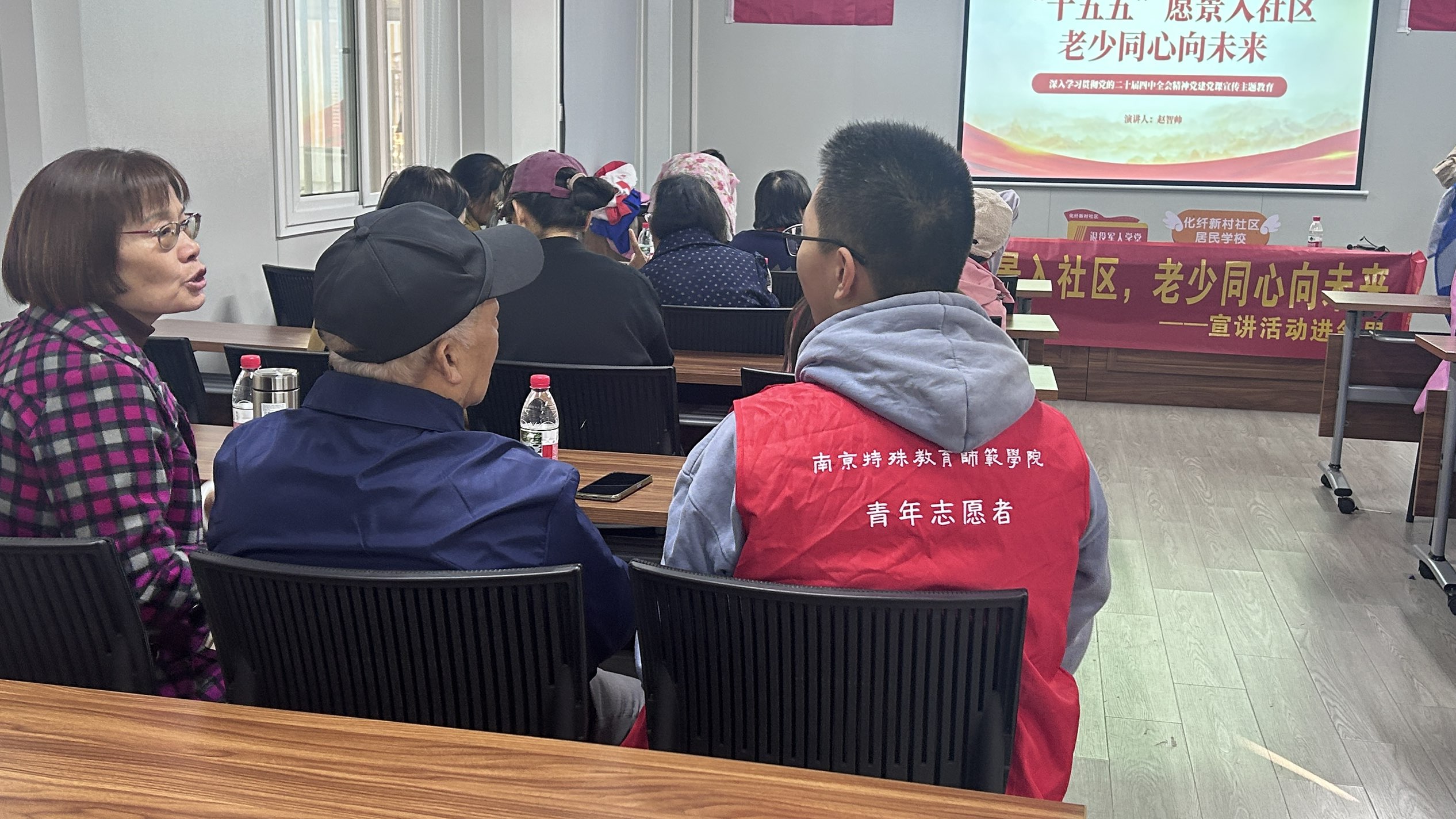 为全面学习贯彻党的二十届四中全会思想,学校“有爱无碍”红色宣讲团于2025年11月12日来到栖霞区化纤新村,面向化纤新村的老人,宣讲关于“十五五”规划的专题思政内容。此次宣讲活动得到了学校团委、马克思主义学院、特殊教育学院和化纤新村居民委员会的指导和支持。