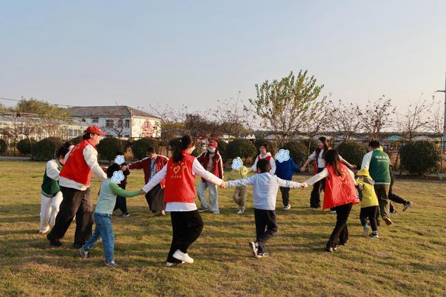 随后开展的“桃花朵朵开”集体游戏将现场气氛推向高潮。孩子们与志愿者手拉手围成圆圈,在口令中欢快组合、互动协作,不仅在游戏中锻炼了反应能力,也在轻松愉悦的氛围中建立起信任与默契。