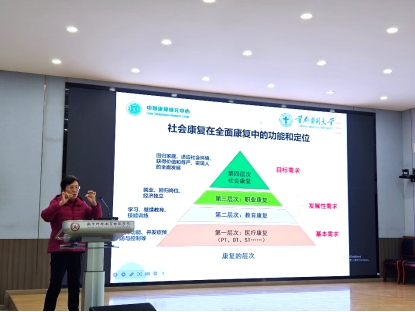 针对专业认知误区,郭微指出,“康复不求痊愈,重在改善功能”。临床与康复诊疗存在差异——临床有“痊愈”评价,康复最高为“改善”“好转”,引导师生树立核心专业理念。结合患者“何时出院”的常见疑问,强调康复的“终身性”,阐释其向社区、家庭延伸的必要性,让师生理解工作的系统性。为让师生更直观理解康复的复杂性,她详细剖析了脊髓损伤患者的康复难点,除肢体功能障碍外,还涉及呼吸系统、泌尿系统等多系统并发症,其中大小便功能丧失、压疮预防等都是康复的重点课题,专业操作对患者康复的关键影响,强化了师生的专业责任意识的同时,更让大家认识到康复事业已进入“医疗康复+教育康复+职业康复+社会康复”的全链条发展阶段。