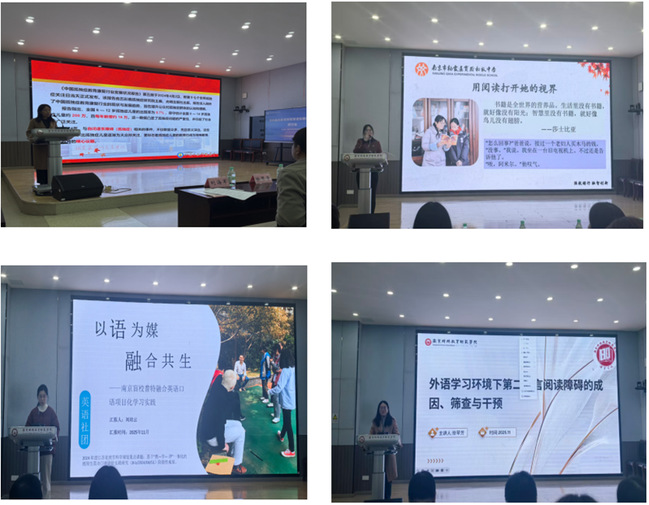 主题报告环节由语言学院副院长刘海军主持。四位来自融合教育一线的专家围绕“融合教育的内涵与实践”展开深入分享。栖霞区教师发展中心融合教育研训员唐柯主任从理念层面重新阐释了融合教育的核心要义;栖霞区实验初级中学杨连红副校长以“境脉融通、随文润心”为主题,介绍了语文教学中的融合支持实践;南京市盲人学校一级教师刘培云分享了以语言为媒介的普特融合英语口语项目化教学实践创新;语言学院副院长徐琴芳教授则从外语学习环境出发,系统探讨了第二语言阅读障碍的成因、筛查与干预策略,为学习困难研究和教学干预提供了研究方向。