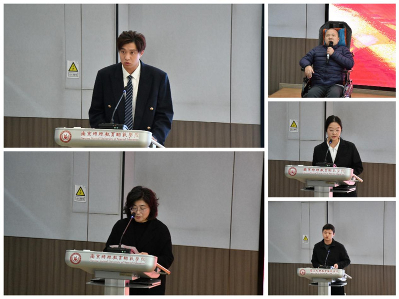 在获奖感言环节,多位代表分享了与融合教育相伴的温暖故事。体育学院的刘皓愉老师代表“最美融合教育教师”发言,讲述了他挖掘孤独症学生的游泳天赋,量身制定个性化训练方案,最终助力其斩获南京高校游泳锦标赛男子200米蛙泳第6名并成功考取游泳救生员职业证书的育人经历。特殊教育学院的方荣老师代表“最美融合教育工作者”发表感言,她将自己定位为融合生生活中的“贴心人”、学业上的“助力者”与梦想路上的“引路人”,通过一个个帮扶细节,展现了教育工作者用爱心架起沟通桥梁的责任担当。“最美融合教育学生”代表、特殊教育学院司济玮同学,分享了自己凭借顽强毅力突破身心障碍,在大学生活中不断突破自我、创造奇迹的奋斗历程,其坚韧精神赢得全场共鸣。“最美融合教育伙伴”代表、管理学院的何舒婷同学讲述了与融合生同学互帮互助,陪伴对方克服困难、在各类学习与活动中斩获佳绩的温暖故事,诠释了同窗情谊中守望相助的青春力量。音乐与舞蹈学院的王阳光老师则代表“优秀融合教育典型育人案例”获奖者分享经验,他为视障音乐生精心准备盲文曲谱与读屏软件,积极为学生争取钢琴展示舞台,在其鼓励下,该学生不仅自信追梦,更荣获国家励志奖学金与“校三好学生”称号,让艺术梦想在融合教育的土壤中绽放。