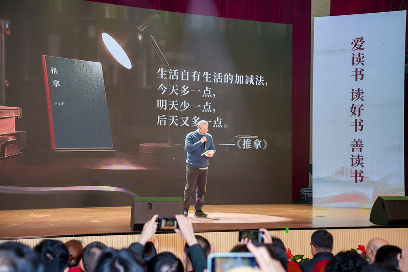 在经典诵读环节,中国作家协会副主席、茅盾文学奖获得者毕飞宇深情朗诵《推拿》片段,第十四届全国政协委员、中国盲人协会主席李庆忠铿锵演绎《将进酒》,展现视障群体与经典文化的深度共鸣。青岛市盲校学生诵读《光明》,南京市宝船小学学生和南京市盲人学校学生携手朗诵《中国话》,传递“普特融合、共沐书香”的温暖理念。
