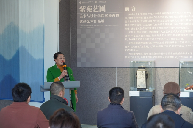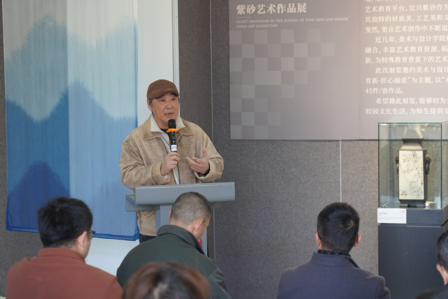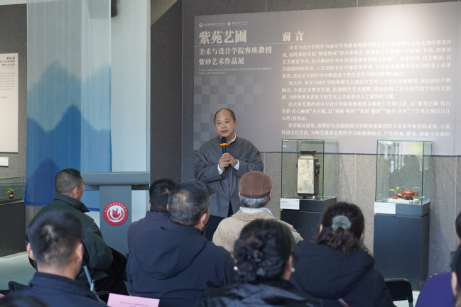 12月3日下午,博爱美术馆内嘉宾云集、艺韵流转,“紫苑艺圃——紫砂作品展”在此开幕。校党委常委、纪委书记于林惠,原南京艺术学院副校长、江苏省工业设计学会理事长何晓佑教授,江苏省陶瓷艺术名人、正高级工艺美术师陈红梅,兄弟高校美术学院院长,以及我校美术与设计学院15位客座教授共同出席活动。活动由美术与设计学院院长赵健主持。