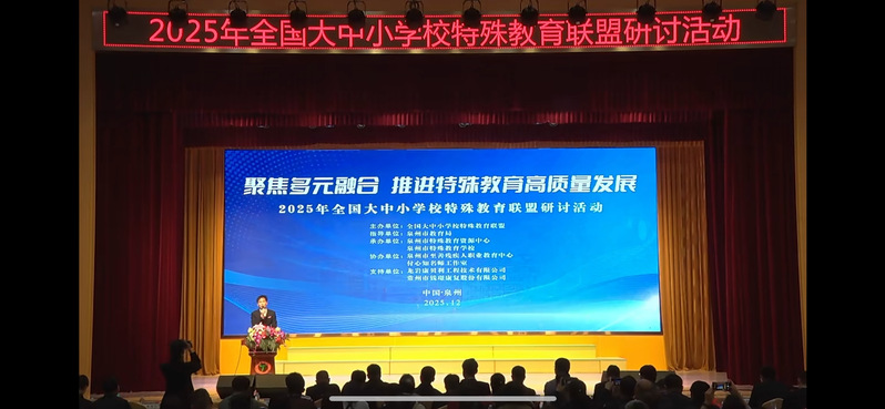为全面贯彻党的二十大“强化特殊教育普惠发展”精神,落实 《“十四五 ”特殊教育发展提升行动计划》相关要求,2025年12月2日,“聚焦多元融合,推进特殊教育高质量发展”研讨会在福建泉州举行。会议由全国大中小学校特殊教育联盟主办,泉州市特殊教育资源中心、泉州市特殊教育学校承办,旨在聚焦多元融合,总结推广特殊教育与普通教育、特殊教育与职业教育等多元融合取得的经验与成效,推动实现“办好特殊教育”目标。联盟理事长、南京特殊教育师范学院党委书记黄军伟,福建省普教室综合科主任程奇,泉州市教育局副局长蔡吉生等领导出席会议,来自全国各地的两百多名特殊教育领域专家学者、一线教师、教育行政部门代表及特邀嘉宾参加了开幕式。开幕式由泉州市特殊教育学校书记、校长蔡景灿主持。