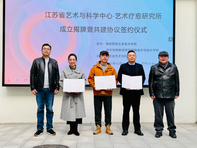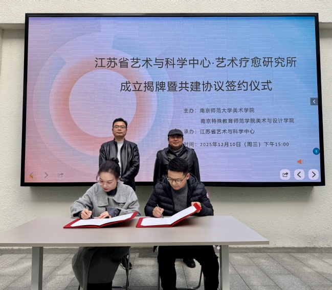 2025年12月10日下午,江苏省艺术与科学中心·艺术疗愈研究所成立揭牌暨共建协议签约仪式在南京师范大学举行。本次活动由南京师范大学美术学院与我校美术与设计学院共同主办,标志着江苏省在艺术与科学交叉融合、推动艺术疗愈实践与研究方面迈出重要一步。