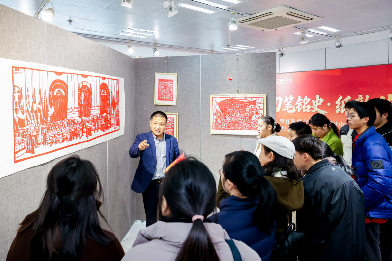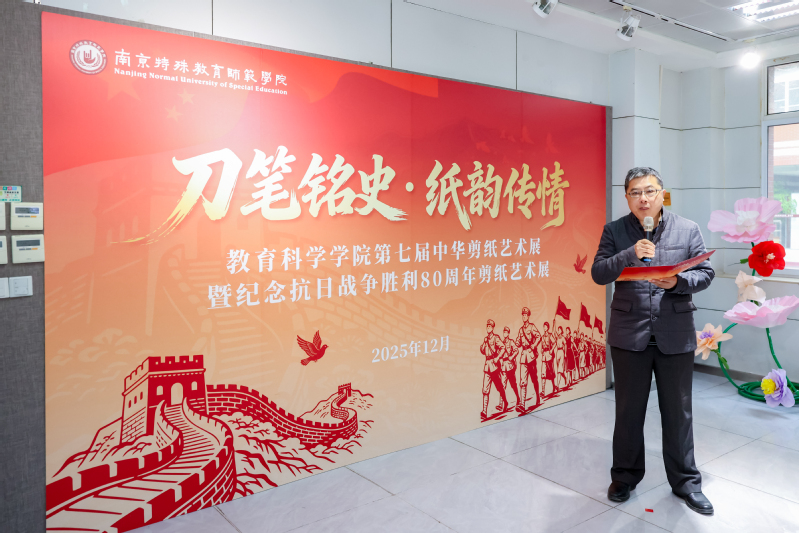 王立新校长宣布开幕,并在讲话中指出,本次展览结合中国人民抗日战争暨世界反法西斯战争胜利80周年宏大主题,以刀为笔、以纸为媒,让展览的筹备过程成为一堂“课程思政”的特色实践。一幅幅作品,以无声的艺术语言,诉说着信仰的力量、和平的珍贵与师道的尊严,凝结了师生的智慧和创新,实现了专业学习与价值引领的同频共振,传承了“博爱塑魂”校训精神。希望全校上下牢记“国之大者”,继续弘扬伟大建党精神,自觉将中国共产党人精神谱系融入思政工作,为党育人、为国育才,为办好人民满意的特殊教育砥砺奋进。