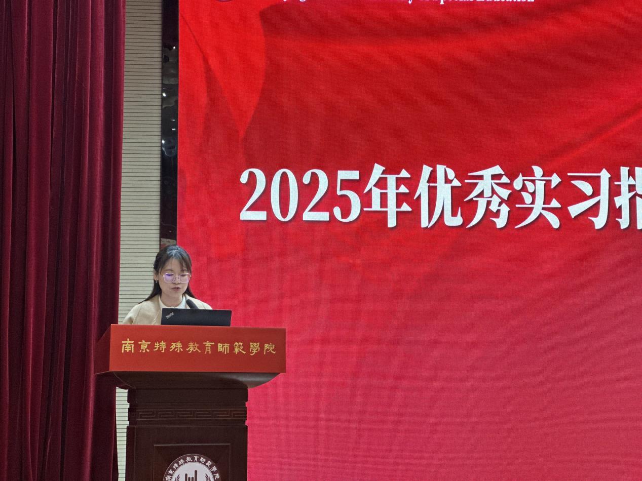 优秀指导教师代表魏婷婷分享了体会。她表示,学院指导教师团队始终秉持“全程陪伴、专业引领、关爱成长”的理念,通过集体指导与个别辅导相结合的方式,助力学生顺利完成从课堂学习到教育实践的角色转变。她欣慰地看到,同学们在实践中不仅巩固了专业知识,更培养了特教工作者必备的责任感与职业情怀。她强调,指导实习的过程也是教学相长的宝贵经历,学生们的成长进步与创新思考同样启发了教师团队的教育教学反思。最后,她寄语全体同学,希望这份在实践中收获的感悟与能力,能够成为大家未来职业发展的坚实基础。