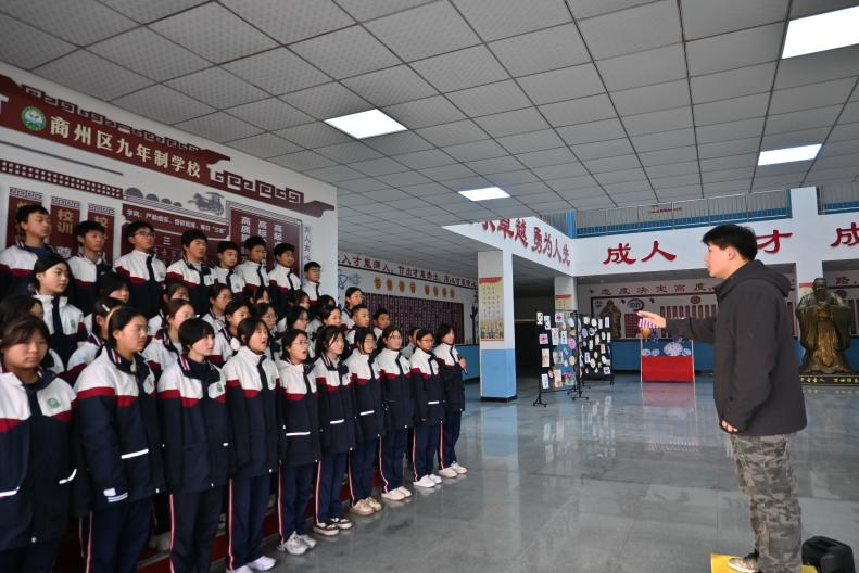 汇报会前夕,师生们精心筹备的成果展在商州区九年制学校精彩呈现。来自商州区九年制学校、商洛市特校、山阳特校等学校的学生作品错落陈列,笔墨间凝结着孩子们的奇思妙想,更镌刻着支教实习生的心血浇灌,成为跨越地域的教育共鸣。音乐与舞蹈学院张雨霁同学带领30名初二学子唱响红色经典《横断山,路难行》,激昂旋律回溯革命岁月,让红色基因在歌声中代代相传,尽显支教带来的精神滋养。