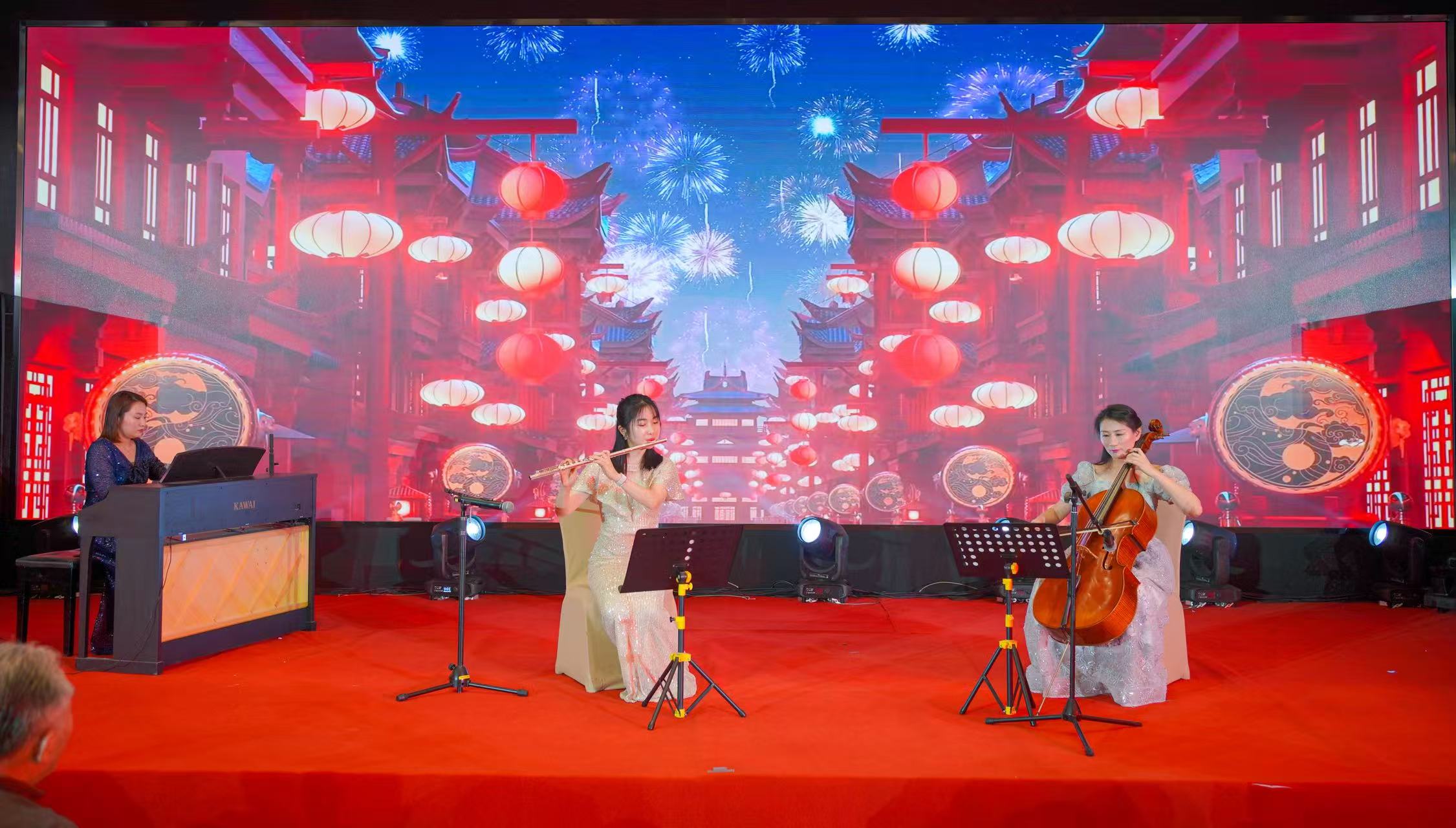 晚会开场,教师唐婷婷倾情献唱开场曲《领航》,她以铿锵旋律、嘹亮歌声拉开晚会帷幕;随后,教师王晓莹、赵芸禾及校美育中心教师周圆老师共同演绎器乐三重奏《灯火里的中国》,悠扬乐声婉转动人,深情描绘了祖国的繁荣图景与万家灯火的温馨祥和。两个节目的呈现,赢得现场观众的热烈掌声,尽显我校教师扎实的专业功底和舞台风采。
