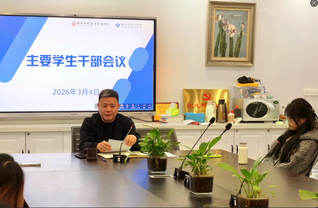 为进一步加强学生骨干队伍建设,夯实新学期学风管理基础,3月4日,美术与设计学院召开2026年春学期主要学生干部工作会议。学院党总支书记陶刚出席会议并讲话,各班主要学生干部参加会议。