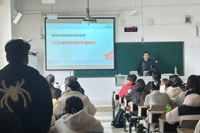 为帮助数学与应用数学(师范)专业学生系统把握教师编制考试最新动态,科学规划复习路径,优化时间管理,切实提升备考效率与竞争力,近日,数学科学学院邀请考编资深指导教师仇国杰老师,开展“2026年教师招聘考情解析”专题指导讲座。学院2022级、2023级学生参加。
