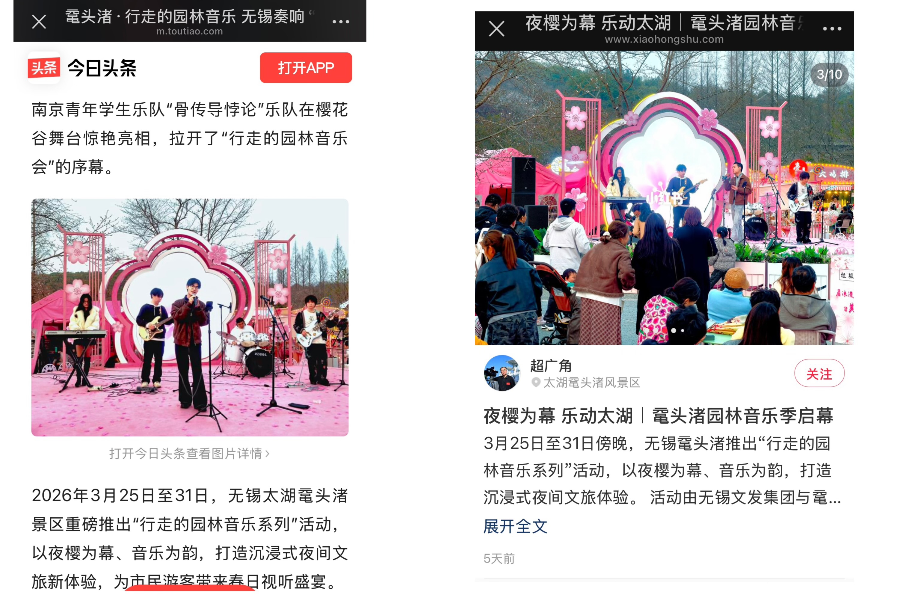 无锡太湖鼋头渚“行走的园林音乐系列”活动,汇聚省内专业艺术家、高校团队与新锐音乐人,打造“七幕夜樱乐章”,将江南园林意境、太湖夜樱美景与音乐艺术深度融合,为游客带来沉浸式视听体验,是长三角地区春季高规格的文旅品牌活动。