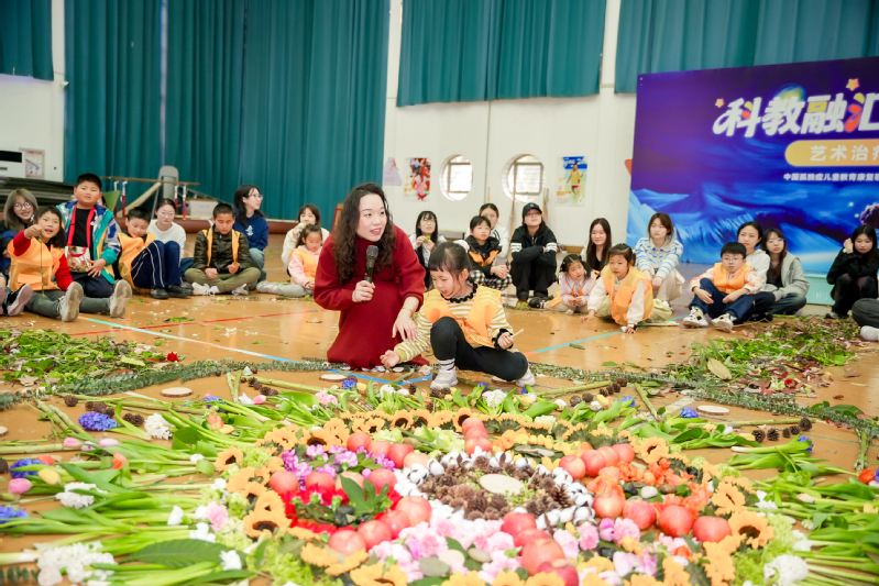 艺术治疗实践共创活动以大地艺术为疗愈载体,邀请南京市50名普通学生与10名孤独症儿童及大学生携手参与。孩子们以落叶、枯枝、花瓣、石子等自然材料为创作媒介,并肩协作完成大型曼陀罗主题大地艺术作品。在自然探索与艺术创作中,打破沟通壁垒、舒展身心情绪,在双向陪伴中收获友谊与成长,让无声的艺术成为连接心灵、消解孤独的温柔纽带,生动诠释了残健融合的深刻内涵。