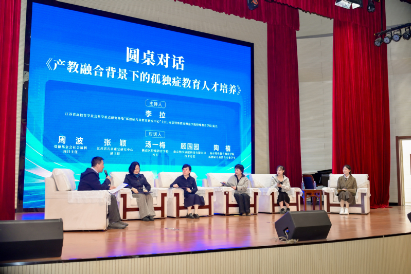 论坛设置圆桌对话环节,由江苏省高校哲学社会科学重点研究基地“孤独症儿童研究中心”主任、我校特殊教育学院院长李拉教授主持。爱德基金会社会福利项目主任周波、江苏省儿童康复研究中心副主任张颖、南京市栖霞区特殊教育学校校长汤一梅、南京怡享康健科技有限公司技术总监顾园园及我校孤独症儿童教育专业学生代表陶禧,围绕“产教融合背景下的孤独症教育人才培养”核心议题展开深度研讨。嘉宾们结合一线实践经验,从人才培养体系构建、产教协同育人模式创新、一线师资专业能力提升、学生职业发展路径拓展等多个维度分享心得,为“十五五”时期孤独症教育专业人才队伍建设建言献策,凝聚行业育人共识。